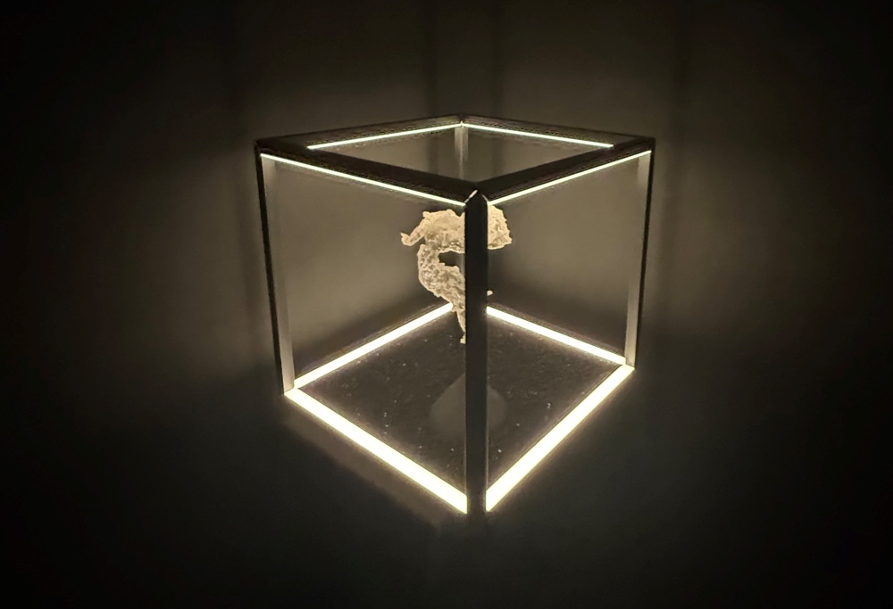 El segundo premio fue para Eduardo de Elío Ontiveros por “Espectro” ,una obra que habla del desgaste de la naturaleza frente a la intervención humana en los territorios naturales. El objeto encierra en sí mismo esa contradicción entre lo natural y lo industrial, unido a la recolección de residuos del entorno natural que forman parte también de la obra, como un pequeño intento de reparación.